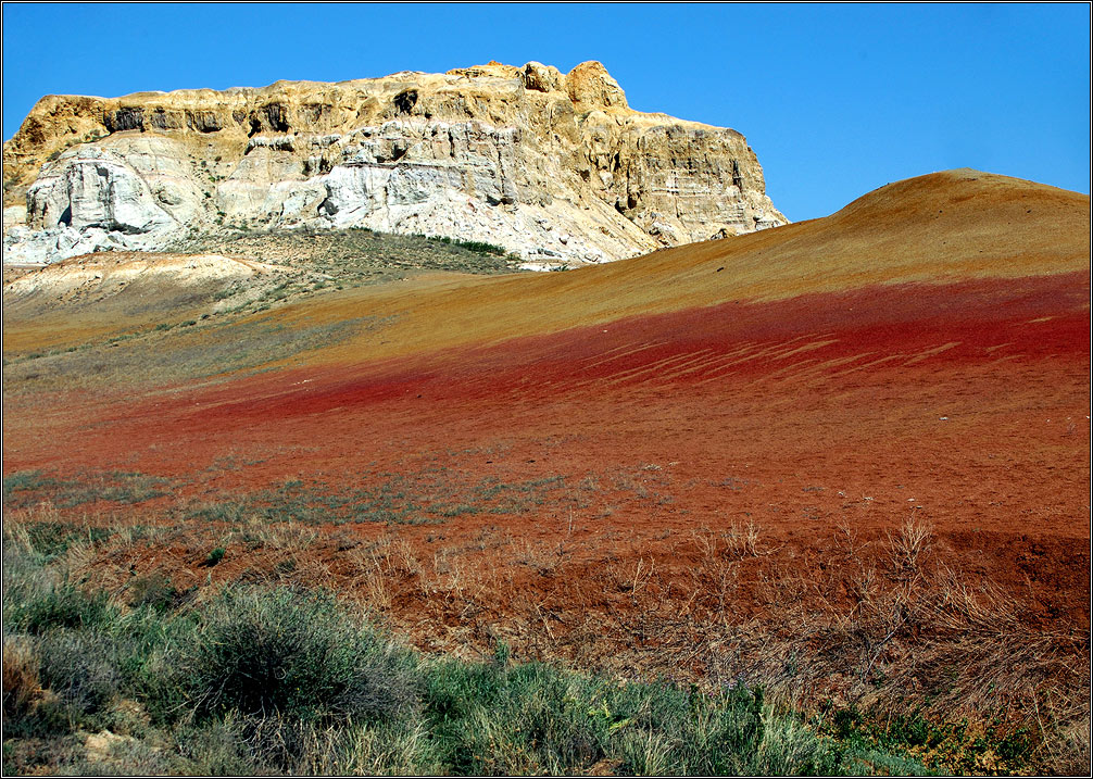 A valuable paleobotanical and geological natural monument with an area of about 150 hectares is noticeable from afar. It appears suddenly and surprises as if you had encountered a dinosaur. The landscape is surreal. It feels like a time machine took you back millions of years. Like a mirage, multi-colored castles suddenly appear from layered sand and clay rocks of the Paleogene epoch. Each of them is bizarrely washed out by the rains. Greenish, gray, red-brown and yellow clays. Here it is, Ashutas, towering over the yellow plain and the green delta of the Black Irtysh.