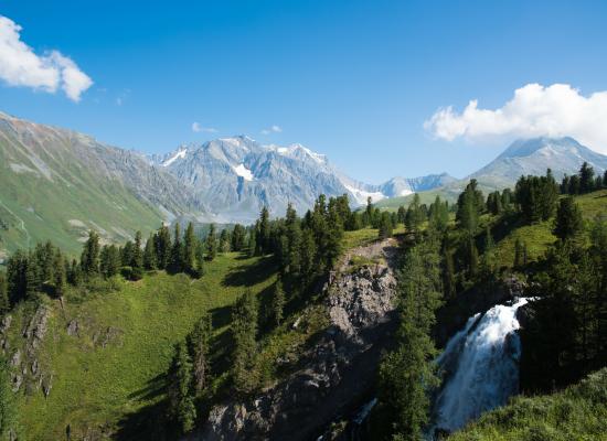Kok-Kol Waterfall is the largest waterfall in Altai. It is located 23 km to the north-east of the resort "Rakhmanovskie klyuchi". At the confluence with the White Berel, the Kok-Kol riverbed approaches a sharp, steep ledge, from where over 10 m wide water flow descends with a deafening rumble that can be heard far around. From a height of about 80 m, a fine water dust is formed, which ionizes the air in the valley. On sunny days it shines with all the colors of the rainbow.